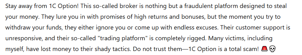 Numerous negative reviews about 1c Option have surfaced across various online forums, review sites, and social media platforms. Many victims have shared their experiences, detailing how the broker manipulated trades, withheld funds, and provided subpar customer service. Here are some common complaints from affected clients: