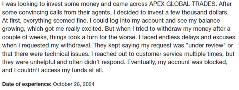 By taking these steps, investors can better protect themselves from falling victim to scams like APEX GLOBAL TRADES.