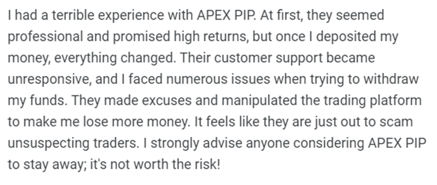 Withdrawal Issues: The most common grievance among APEX PIP’s customers is the inability to withdraw their funds. Some traders have even reported that the company fabricated excuses to delay or block withdrawals indefinitely.