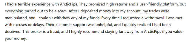 Another major sign of fraud is the broker’s refusal to process withdrawal requests. Victims of ArcticPips have shared their experiences of making multiple attempts to withdraw their earnings, only to be met with delays, excuses, or outright denials. In some cases, customers have reported that their funds were locked in their accounts, with no way to access them.