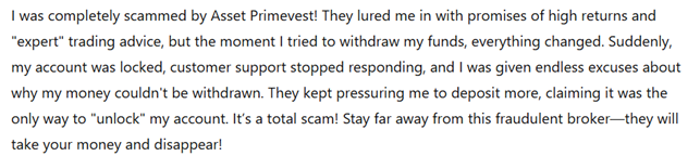 These complaints paint a clear picture of the broker’s fraudulent practices, further confirming that Asset Primevest is a scam.