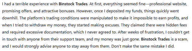 The internet is filled with negative reviews from traders who have fallen victim to Binstock Trades. Many victims report that the broker’s platform is designed to extract funds without providing any legitimate means of trading. Several online forums dedicated to trading scams have highlighted the broker’s lack of transparency and its deceptive marketing tactics.