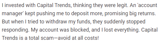 Numerous negative reviews and complaints about Capital Trends have surfaced, with affected clients warning others to steer clear of the broker. Common complaints include difficulties withdrawing funds, unresponsive customer service, and suspicious activity in trading accounts. Many clients report feeling pressured by account managers who urged them to make additional deposits, only for their accounts to be blocked or frozen when they requested withdrawals. These experiences are unfortunately common among scam brokers, but they serve as a warning to potential investors.