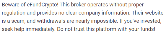 - Aggressive Marketing Tactics: Many scam brokers use high-pressure marketing tactics to lure in potential investors. eFundCrypto is no different, likely bombarding potential customers with promises of high returns, often making unrealistic claims that sound too good to be true. These tactics are commonly used to lure unsuspecting individuals into making deposits quickly without giving them time to thoroughly research the platform.