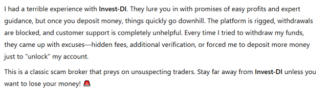Invest-DI’s reputation among traders is overwhelmingly negative. A quick search for reviews reveals countless complaints from people who have fallen victim to their fraudulent tactics. Many clients report that they were initially drawn in by the broker’s promises of high returns and easy profits, only to later realize they were being scammed.