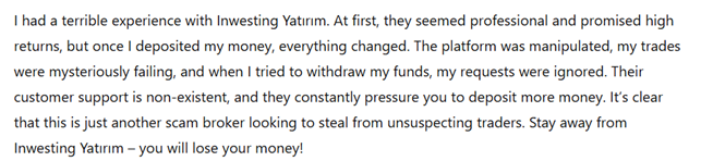Victims of Inwesting Yatırım have shared their negative experiences on various online platforms. Many reports describe how investors were initially promised high returns but later faced difficulties accessing their accounts or withdrawing funds. Victims have claimed that after making deposits, they were either ignored or given unreasonable excuses for the delay in processing their withdrawals.