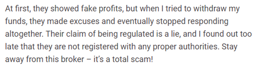 Inability to Withdraw Funds: Many investors report that after making profits (or appearing to), they were unable to withdraw any money from their accounts. In most cases, the broker either stopped responding to communications or invented excuses to delay withdrawals indefinitely.