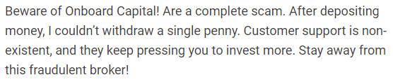 - Inability to Withdraw Funds: A common complaint from victims is that they were unable to withdraw any of their money after depositing it into their Onboard Capital accounts. Many users reported that their requests for withdrawals were ignored, delayed, or outright rejected.