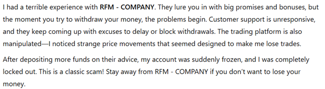Delayed or Blocked Withdrawals: Once traders deposit money into their RFM COMPANY accounts, the real scam begins. Investors frequently report that the broker either delays or entirely blocks withdrawal requests. In some cases, clients have been asked to submit additional documents or pay additional fees to access their funds. This tactic is designed to wear down the client’s patience and eventually make them give up on retrieving their funds.