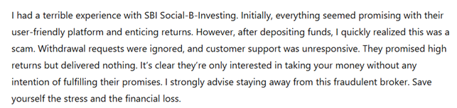 There is a growing number of negative reviews online from individuals who claim to have been defrauded by SBI Social-b-investing. Many of these reviews highlight the same issues: difficulty withdrawing funds, poor customer service, and pressure tactics to deposit more money. Victims have described how their accounts were manipulated, and how the broker’s customer service team was unresponsive or dismissive of their concerns.