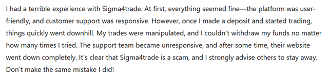 One common thread among the reviews is that Sigma4trade initially provides good customer service and appears to be a reliable platform. However, once traders make significant deposits, they are met with silence or vague responses when requesting to withdraw their funds. These victims feel trapped and powerless, with no clear way to recover their money.