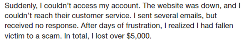 Emotional Distress: Clients have reported feelings of anxiety and stress as a result of their financial losses, highlighting the emotional toll these scams can take on individuals.