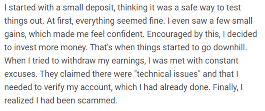 Withdrawal Issues: Eventually, victims discover that withdrawing their funds is nearly impossible, as the broker imposes stringent conditions or outright denies withdrawal requests.