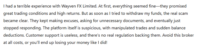 The online community is filled with negative reviews and complaints about Wayven FX Limited. Clients who have fallen prey to the broker’s scams consistently report being misled by false advertising and deceptive practices. Common complaints include: