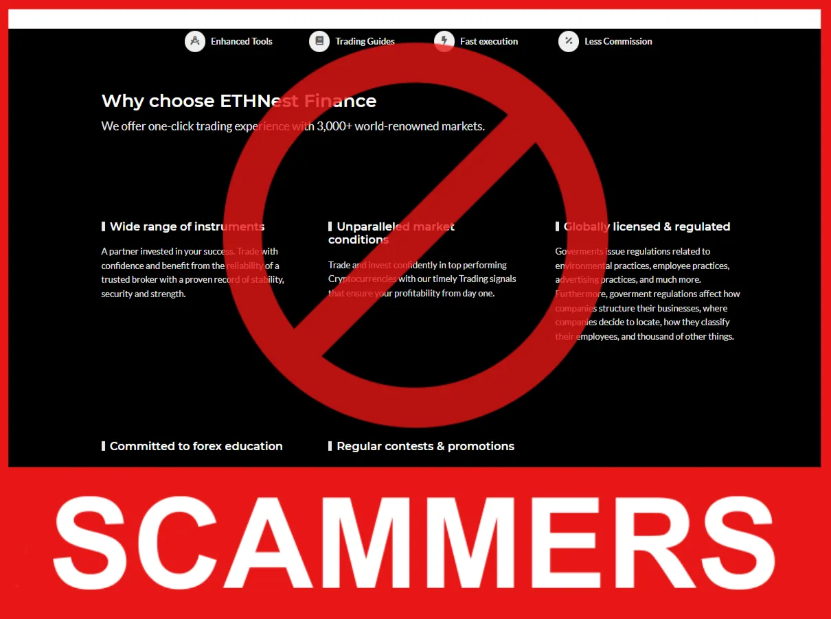 Several indicators suggest that ETHNest Finance may be operating under a high-risk or potentially fraudulent model. Lack of Regulation. As mentioned, there is no solid proof of licensing by a recognized authority. This alone significantly increases the risk for investors. Unrealistic Profit Expectations. Platforms that imply consistently high returns or suggest that professional managers can “guarantee” success are typically misleading clients. In financial markets, there are no guarantees. Pressure to Deposit More Funds. Victims of fraudulent brokers frequently report that once they make an initial deposit, they are encouraged to invest more. Account managers may claim that larger deposits will unlock better opportunities or higher profits. Withdrawal Problems. One of the clearest signs of a scam broker is difficulty withdrawing funds. Clients may encounter delays, additional “fees,” unexpected taxes, or complete silence from support when requesting a withdrawal. Manipulated Trading Environment. In many fraudulent operations, the trading platform itself is not connected to real markets. Instead, balances and profits are simulated. Clients believe they are earning money, but the displayed profits exist only within the broker’s internal system. Taken together, these factors form a pattern that closely resembles known online trading scams.